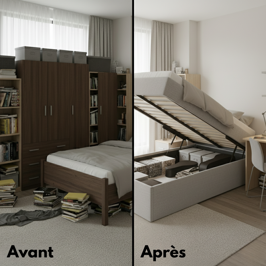 Qu’il s’agisse d’un lit double avec rangement, d’un lit escamotable ou d’un modèle mezzanine, chaque pièce est conçue pour libérer de la place et transformer votre chambre en un lieu clair, ordonné et apaisant.